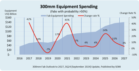 Worldwide, 300mm fab equipment spending is projected to grow by 4% to US$99.3 billion in 2024, and further increase by 24% to US$123.2 billion in 2025, surpassing the US$100 billion level for the first time. Spending is forecast to experience 11% growth to US$136.2 billion in 2026 followed by a 3% increase to US$140.8 billion in 2027.