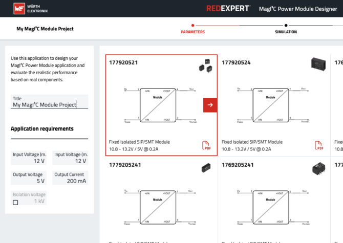WURTH ELEKTRONIK RedExpert MagI³C Power Module Designer online platform for the simple selection, simulation and design-in of Würth Elektronik components, features a new function. Platform enables the swift and hassle-free integration of a power module into an application without requiring special dc-dc converter skills. Tool guides developers step-by-step through the entire selection and configuration process. The automatically created design proposal is rendered as a PDF file, together with a list of the components required. The tool also offers an option for the direct order of samples of selected Würth components.